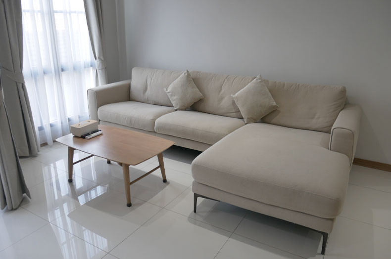 白を基調としたスタイリッシュなリビング。タイルの床で清潔感があります。