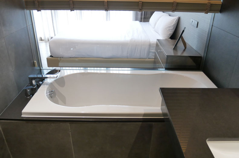 ガラス張りになっており、開放感のあるバスタブ付きの浴室。