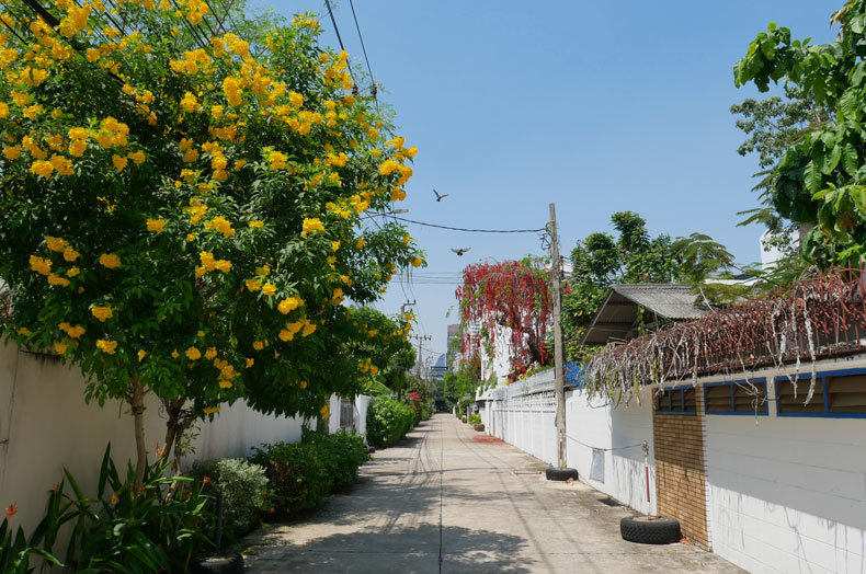 ピーピーアール レジデンスは、プラカノンのプリディ27に立地しており、物件周辺は閑静な住宅街で、車通りが少なく道幅の広い通り沿いにはブーゲンビリアなどの花が咲き、南国らしさを味わえるロケーションです。日本人幼稚園のオイスカ幼稚園が近く、スクンビットソイ71沿いにはマックスバリュやマクロなどのスーパーがあります。また、エカマイソイ12からスクンビットソイ63へ抜けることができ、ドンドンドンキの入ったドンキモールトンローやビッグCなどへ行くことができます。