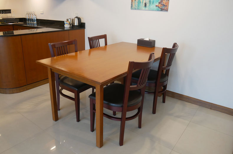ダイニングスペースは広くとられており、シンプルで上質な素材のテーブルセットで快適に食事できます。