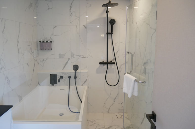 大理石で高級感のある、バスタブ付きの浴室。